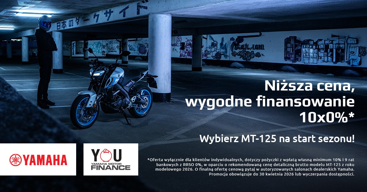 Yamaha MT-125 z rocznika modelowego 2026 [https://www.yamaha-motor.eu/pl/pl/motorcycles/hyper-naked/pdp/mt-125/] dostępna jest teraz w niższej cenie. Twój portfel podziękuje Ci jeszcze bardziej dzięki atrakcyjnemu finansowaniu 10×0%, dzięki któremu jazdę zaczniesz natychmiast, a koszt zakupu rozłożysz na kilka rat. Nie odkładaj decyzji na później i rozpocznij sezon motocyklowy już teraz – posiadając samochodowe prawo jazdy!